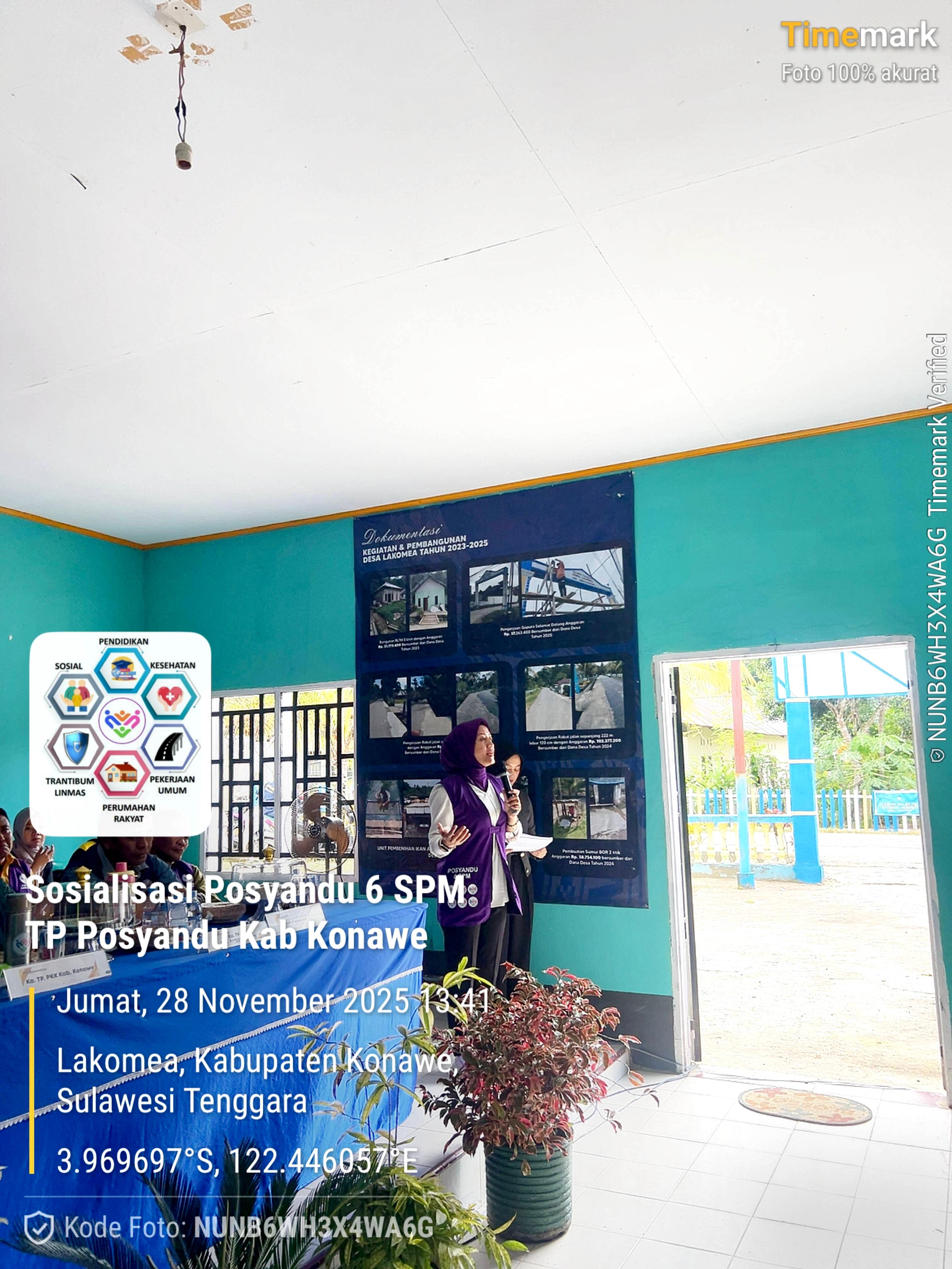 Konawe — Tim Pembina Posyandu 6 Bidang Standar Pelayanan Minimal (SPM) Kabupaten Konawe melaksanakan kegiatan sosialisasi Posyandu 6 Bidang SPM sebagai upaya memperkuat layanan dasar Pendidikan, Kesehatan, Pekerjaan Umum, perumahan, Sosial dan Trantibumlinmas di tingkat Kelurahan/Desa. Kegiatan ini dilaksanakan di balai desa Lakomea Kecamatan Anggalomoare Jumat 28/11/2025 dan dihadiri para kader posyandu, Kepala Kecamatan/Desa/Kelurahan, tokoh masyarakat, serta perwakilan OPD terkait.